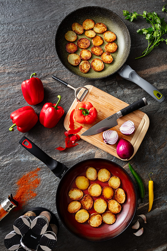Brambory na středním plameni pomalu opékáme, plátky musejí být co nejvíce u sebe a nesmějí se překrývat. Po cca 10 minutách brambory obrátíme a opékáme dalších 8 ndash; 10 minut. Jakmile jsou brambory zvenku křupavé a uvnitř měkké, osolíme je, opepříme a vyjmeme z pánví.