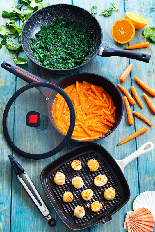 Zbylé máslo rozehřejeme a osmažíme na něm cibuli a mrkev. Lehce osolíme a pod pokličkou krátce, maximum 10 minut, podusíme. Přilijeme zredukovanou šťávu a ještě spolu svaříme až šťáva zhoustne. Dochutíme solí a pepřem. Špalíčky masa svatojakubek osušíme, potřeme olejem a zprudka opečeme, nejlépe na grilovací pánví. Hotové hřebenatky podáváme se špenátovou směsí.