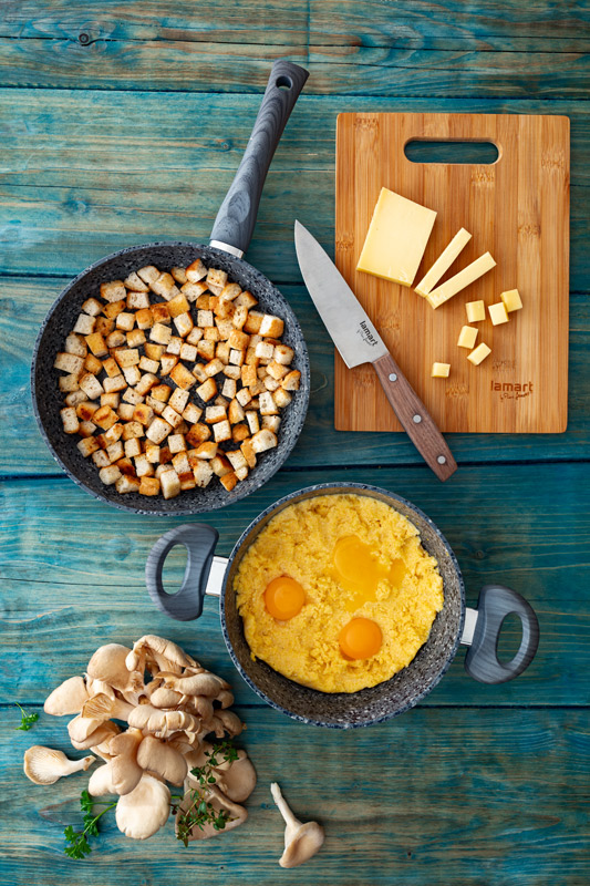 Ve větším hrnci uvedeme do varu mléko a smetanu. Přidáme mouku na polentu a za stálého míchání vaříme dokud polenta nebude hustá a vláčná. Necháme ji vychladnout.
