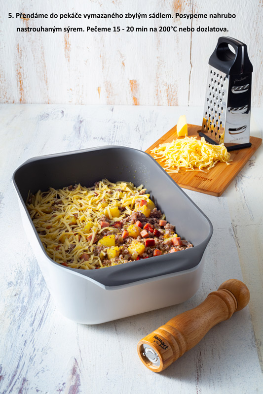 Přendáme do pekáče vymazaného zbylým sádlem. Posypeme nahrubo nastrouhaným sýrem. Pečeme 15 - 20 min  na 200°C nebo dozlatova.
