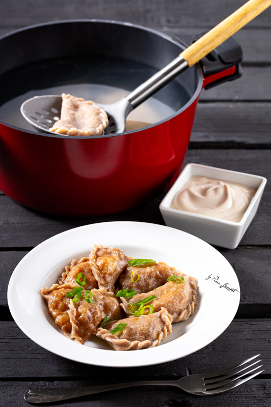 Těsto vyválíme na 2 mm tenký plát, pomocí sklenice vykrajujeme kolečka a klademe na ně kopečky bramborové náplně. Těsto přeložíme, aby nám vznikly půlměsíčky. Okraje dobře přimáčkneme.