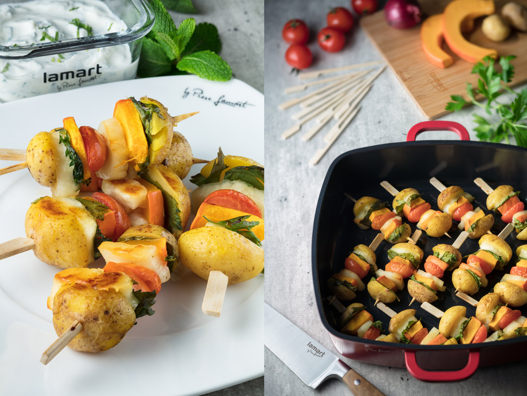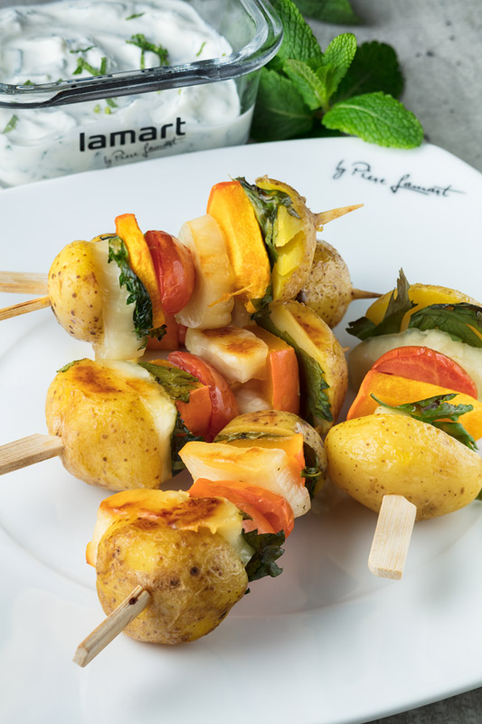 Vegetariánské špízy se sýrem a mátovou omáčkou