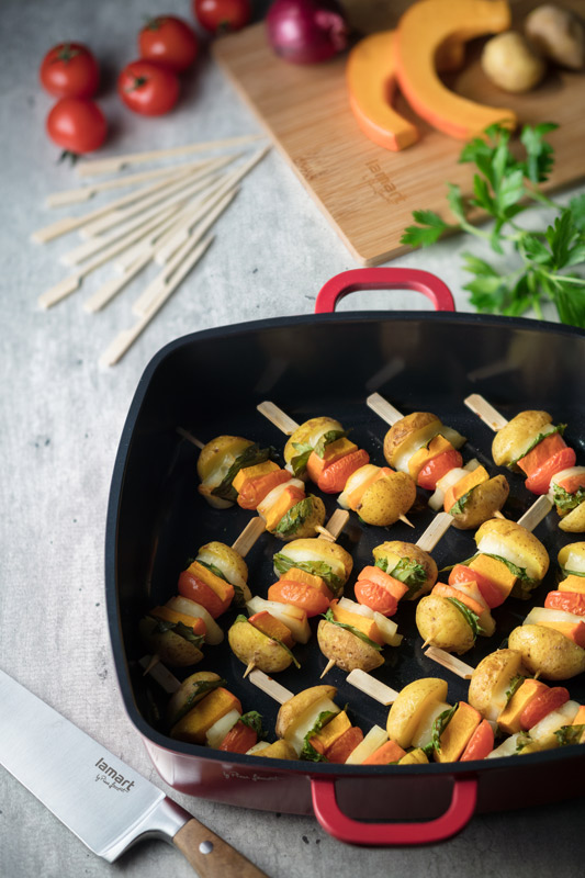 Střídavě napichujeme rozpůlené osolené brambůrky, sýr, dýni a plátky červené cibule na špíz. Hotové špízy klademe do pekáče na pečící papír. Pokapeme olivovým olejem, sirupem ze svařené pomerančové šťávy a opepříme. Přidáme pár snítků tymiánu a pečeme v troubě na 180°C cca 20-25 minut.