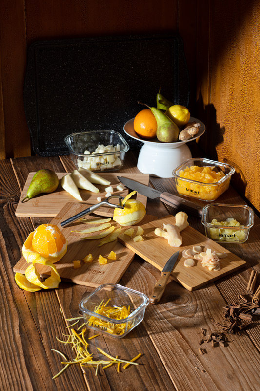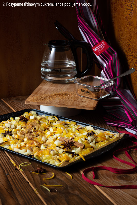 Zázvor oloupeme nožem nebo obyčejnou škrabkou na brambory. Nakrájíme ho do pekáčku na tenké plátky. Dobře omyté citrusy zbavíme kůry i s bílou slupkou a nakrájíme je na kostičky cca 1x1 cm a přidáme k zázvoru spolu s kořením.