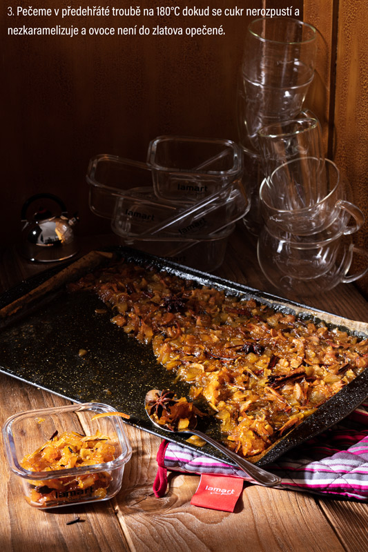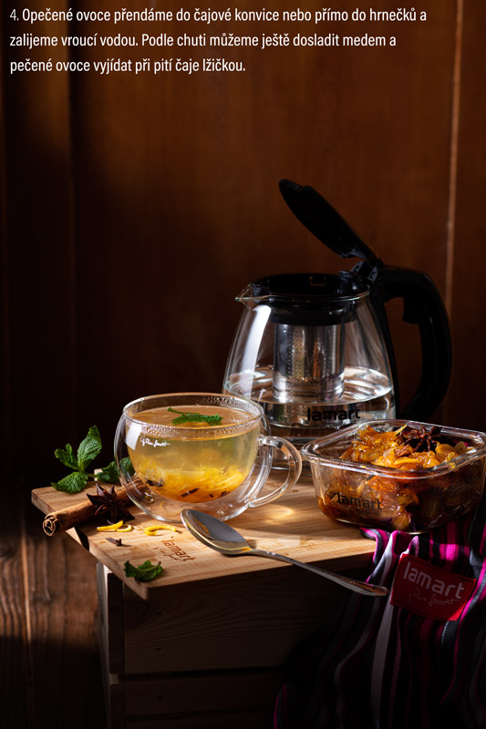 Opečené ovoce přendáme do čajové konvice nebo přímo do hrnečků a zalijeme vroucí vodou. Podle chuti můžeme ještě dosladit medem a pečené ovoce vyjídat při pití čaje lžičkou.
