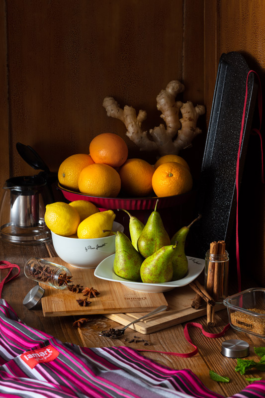 Skořici rozlámeme na menší kusy. Přidáme očištěné a na kostičky nakrájené hrušky. Z citrusové kůry, kterou jsme okrájeli, ještě odřízneme bílou hořkou slupku, kůru nakrájíme na proužky a přihodíme ke směsi. Posypeme třtinovým cukrem, lehce podlijeme vodou a pečeme v předehřáté troubě na 180°C, dokud se cukr nerozpustí a nezkaramelizuje a ovoce není do zlatova opečené.